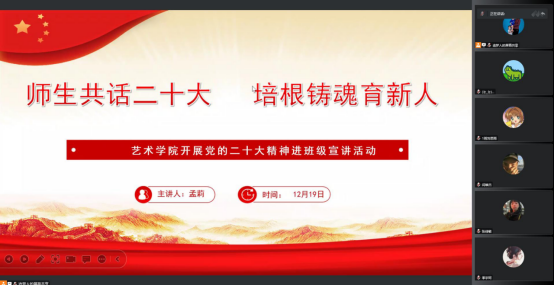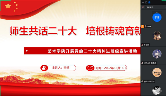 为深入学习宣传贯彻党的二十大精神,把全院师生的思想统一到党的二十大精神上来,落实立德树人的根本任务。根据《中共申搏sunbet委员会关于认真学习宣传贯彻党的二十大精神的通知》,申搏sunbet分别于12月16日至20日期间,组织开展了“师生共话二十大 培根铸魂育新人”党的二十大精神进班级宣讲活动。全体辅导员走进班级,开展“党的二十大精神”主题云宣讲会,引导公司学子进一步了解大会精神,把握核心要义,深入推进党的二十大精神入脑入心。