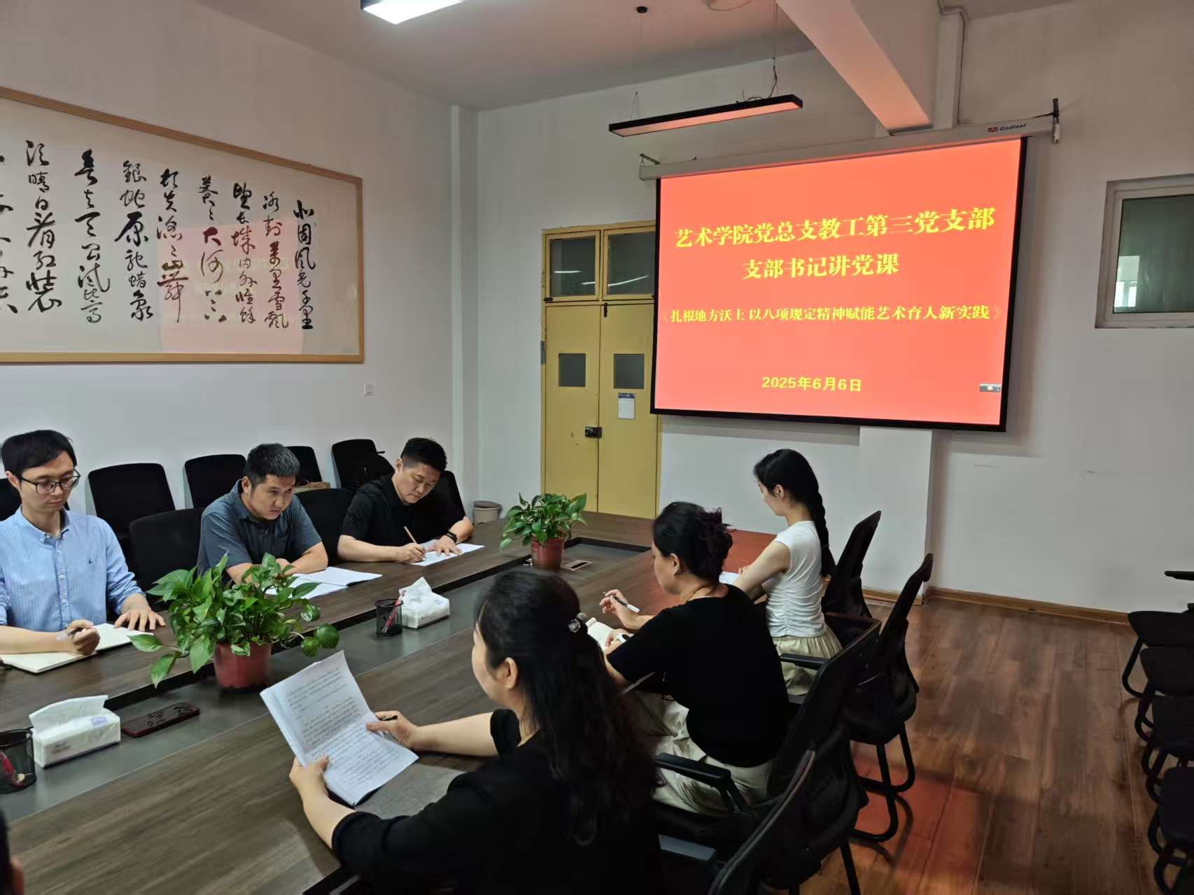 6月6日,申搏sunbet教工第三党支部书记李磊为全体党员带来了一场主题为《扎根地方沃土,以八项规定精神赋能艺术育人新实践》的深刻党课,旨在引导党员深入理解中央八项规定精神,探索其在艺术教育领域的落地路径,推动音乐系公司产品工作迈向新高度。