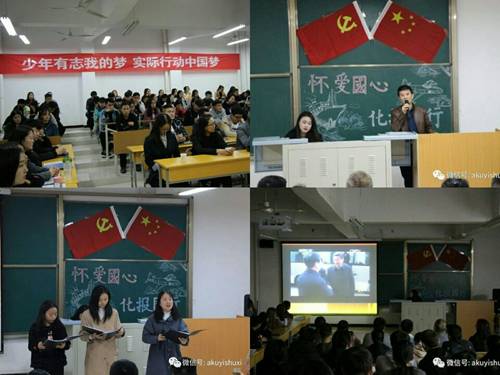 班会上,还邀请退役复学的2014级视觉传达设计1班罗宇乾和2015级音乐学1班郭春平同学介绍他们在部队的生活经历和体会:两年军营生活,让自己改变了很多,收获了很多。昔日里在训练场、演训场上的挥汗如雨,和战友们在一起经历过的风风雨雨,一切依然历历在目,刻骨铭心。有人说当兵后悔两年,不当兵后悔一辈子;我说当兵两年不后悔,不当兵才后悔一辈子。也有人问:当兵那么苦,那么累,你为什么还要去?值得吗?我说:值得!当兵确实很苦很累,每天摸爬滚打,斗严寒,战酷暑,抗风沙,一身泥一身汗,可是它磨炼了我们钢铁般的意志品质!南开大学八名学子歇笔从戎,参军入伍给当代老员工作了一个很好的榜样。他们把自己的个人梦,融入到了中国梦当中,将自己的爱国之心,化为投身强军之行。现在复原回到熟悉的校园,使我们更加珍惜来之不易的学习环境,我们要严格要求自己,遵守校纪校规,为其他同学做出遵守纪律的楷模;努力学习专业技能,提高自身素质,毅然决然地承担起中华民族伟大复兴的历史重任,不辱使命,上得去,顶得住。用自己的青春书写无愧时代,无愧于历史的华丽篇章!