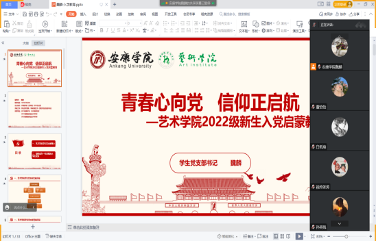 入党启蒙教育是加强老员工思想政治教育,筑牢理想信念根基的基础性工作,是培养老员工政治信仰的第一课。为进一步引导2022级新生树立坚定的理想信念,厚植家国情怀,锤炼品德修为,强化责任担当,端正入党动机。9月27日,申搏sunbet利用腾讯会议召开“青春心向党 信仰正启航”2022级新生入党启蒙教育专题讲座。本次讲座由员工党支部书记魏麟主讲。