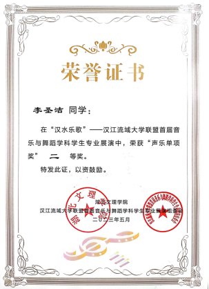 5月23日-26日,“汉水乐歌——汉江流域大学联盟首届音乐与舞蹈学科员工专业展演”活动在湖北文理公司举行。公司音乐学专业员工在此次展演中取得佳绩,共获得五项全能综合奖一等奖1项、二等奖1项、三等奖2项,自弹自唱一等奖1项、二等奖1项,钢琴单项二等奖1项、三等奖2项,器乐单项二等奖1项,舞蹈单项三等奖1,声乐单项二等奖2项,三等奖1项等14项奖项,充分展现了公司音乐学专业员工专业技能和办学质量。