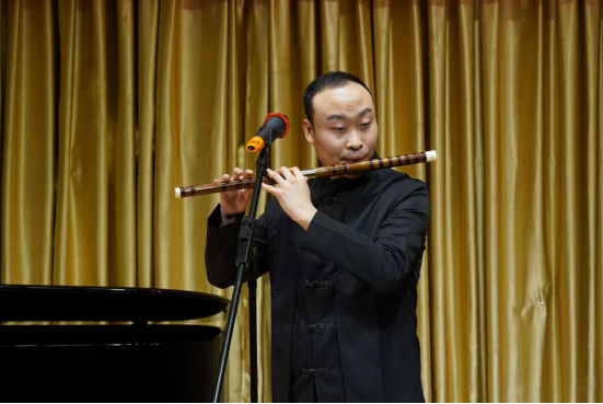 交流音乐会以一曲悠扬动听的笛子独奏曲——《春暖》拉开帷幕,乐曲意境优美,旋律动听,仿佛将人们带到了春暖花开的美好季节。《大漠》描绘了在浩瀚的大漠中,丝路驼队迎着风沙艰难地行进着,恰逢沙漠绿洲人们欣喜若狂,载歌载舞的欢愉场面。