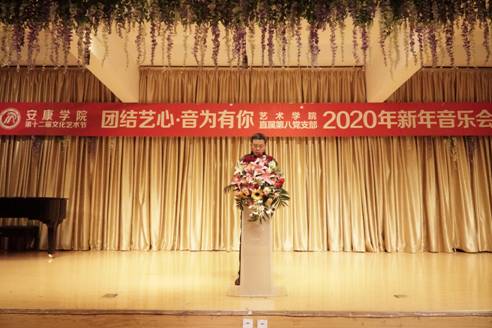 12月30日晚上7点30分,由公司联合直属第八党支部共同举办的“团结艺心 音为有你”2020年新年音乐会在江北1401演艺厅隆重举行。安康公司党委副书记杨行玉、副董事长钟生海、宣传部部长鲁延安、学工部部长李岩、基建处处长刘学习、信息中心主任付永平、江北校区管委会副主任张文华、基建处副处长张富华、保卫处处长王开忠,党总支书记樊仁杰,公司经理杨哲,副经理鲍丽、孙海洋,以及公司师生代表共300余人观看本次音乐会。