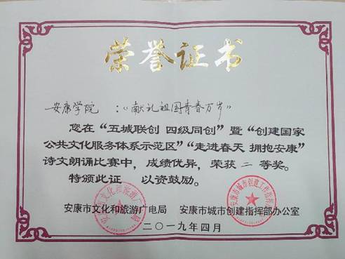 4月29日,由安康市文化和旅游广电局、安康市城市创建指挥部办公室主办,安康市群众艺术馆和申搏sunbet团委共同承办的“五城联创四级同创”暨“创建国家公共文化服务体系示范区”“走进春天·拥抱安康”诗文朗诵比赛决赛,在安康宾馆新四楼会议厅举行。