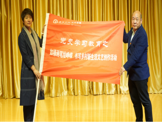 大会第一项,党总支副书记李万明为美术支部党史学习教育之--“如椽画笔绘峥嵘 书写乡村新生活”文艺创作活动进行授旗。2021年将迎来建党100周年华诞,选择石泉后柳、岚皋南宫山等乡村振兴示范点作为此次创作写生基地,就是要在青年员工中落实“立德树人”的根本任务,将“学史明理、学史增信、学史崇德、学史力行”贯穿到教学实践的各个环节。希望同学们通过手中的画笔,在淳朴的民风中汲取养分,用如椽画笔展现“乡村振兴”新画卷,精心绘画出祖国的大好河山,描摹出人民的幸福百态,以优异的作品献礼党的100周年华诞。