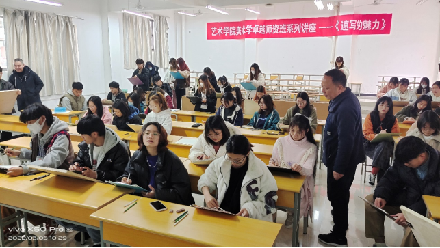 3月5日上午,申搏sunbet邀请陕西省美术学科教学能手,安康中学高级美术教师何涛老师在江北2202阶梯教室为首届卓越美术教师团队班同学们做《速写的魅力》讲座,讲座由美术系主任杜敏主持。