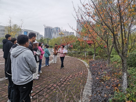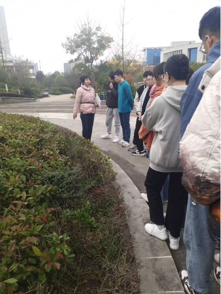 现场教学在江北校区进行。杨湘涛老师以江北校区1、2号教学楼与滨湖景区之间的植物景观配置为主题,讲解和启发员工学习景观植物在造景中的应用,根据课程特点植入课程思政主题——审美素养与文化自信。