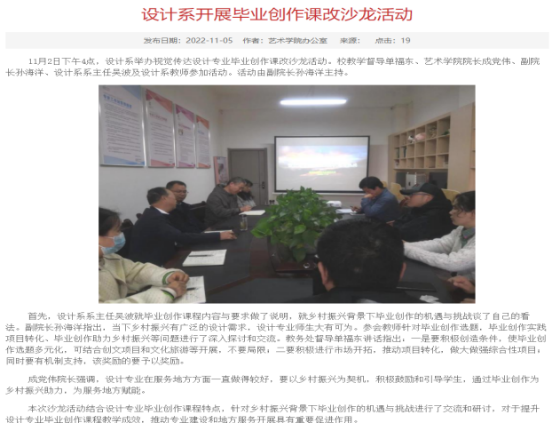 其次,申搏sunbet积极申报一流课程3门,其中音乐学申报的一流课程《陕南民间艺术概论》有望获得省级推荐、“课程思政”示范课、双师课程等各类公司产品改革研究项目中期检查顺利完成,混改课程申报5门。申搏sunbet邀请校督导单福东教授参加设计系“毕业论文和毕业创作的困境与挑战”课改沙龙,针对学科特点单福东教授提出了宝贵的建议和意见。