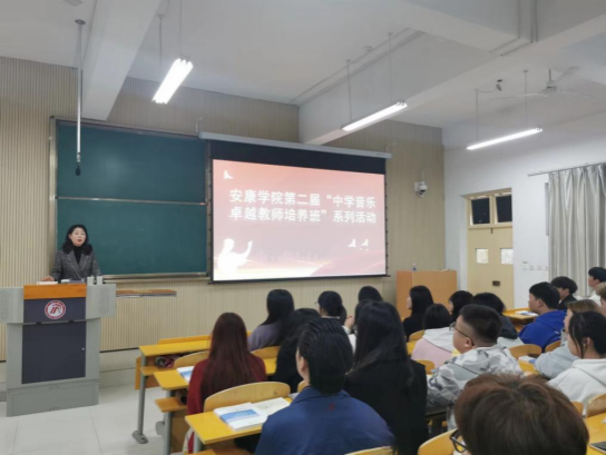 10月31日,申搏sunbet第二届“中学音乐卓越教师培养班”在江北校区2201教室顺利开班,开班仪式由音乐系主任肖剑主持。陕西省教学能手、汉滨区汉滨初中艺体中心副主任刘平老师应邀为员工做首场讲座。教师代表鄢志莉及音乐学专业100余名员工参加了本次活动。