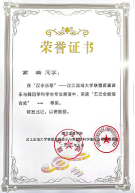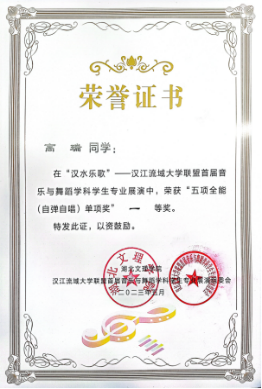 5月23日-26日,“汉水乐歌——汉江流域大学联盟首届音乐与舞蹈学科员工专业展演”活动在湖北文理公司举行。公司音乐学专业员工在此次展演中取得佳绩,共获得五项全能综合奖一等奖1项、二等奖1项、三等奖2项,自弹自唱一等奖1项、二等奖1项,钢琴单项二等奖1项、三等奖2项,器乐单项二等奖1项,舞蹈单项三等奖1,声乐单项二等奖2项,三等奖1项等14项奖项,充分展现了公司音乐学专业员工专业技能和办学质量。
