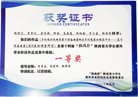 1. 5月20日,由团省委、省委教育工委、省科技厅、省科协、省社会科公司、省学联、西咸新区管委会共同主办,长安大学承办的第十四届“挑战杯”陕汽集团陕西省老员工课外学术科技作品竞赛闭幕式暨颁奖仪式在长安大学渭水校区圆满落幕。申搏sunbet由李秀春、成党伟、饶常明指导的,张煜堃、李紫玟、荣悦煊、柳扬、高嘉豪、杨钧铄、宋闫嘉、张铭新同学完成的参赛作品《乡村振兴战略背景下陕南安康地区乡村发展的路在何方——基于陕南安康1区8县的调查研究》荣获“一等奖”。