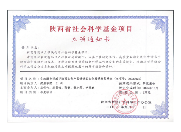 4.9月21日,陕西省哲学社会科学工作办公室公布了2023年陕西省社会科学基金年度项目立项名单。公司任川博士的“文旅融合视域下陕西文创产品设计的文化转译路径研究”(2023J332)课题获得2023年度立项,这是任川博士2023年继省社科联社科基金项目之后获批的第二个纵向项目,也是申搏sunbet高层次人才队伍建设的重要成果呈现之一。近三年来,申搏sunbet引进博士引育博士17名,晋升教授2名,高层次人才队伍建设初见成效。