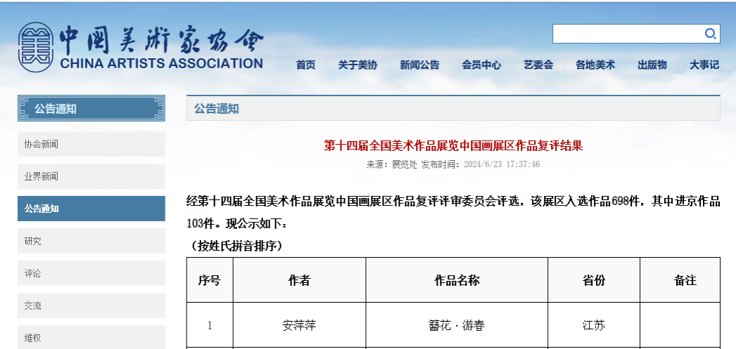 6月23日,中国美术家协会发布“第十四届全国美术作品展览中国画展区作品复评结果”,入选作品698件,公司章长青老师1件作品《高速时代》入选。