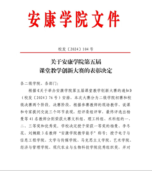 7.8月,中共陕西省委教育工委对2024年陕西高校辅导员先进典型推选展示活动中表现突出个人进行表扬通报,公司辅导员鲁澧荣获“2024年陕西高校表现良好辅导员”称号。