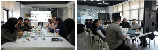 3月16日,师生团队乘火车抵达西安,首站入驻欧亚公司。次日,实践教学以一场“双线并行”的活动拉开序幕:欧亚公司牛玉玺老师为员工做“About 设计”专题讲座,随后带领员工参观了欧亚设计博物馆,通过展陈的现代设计作品与数字艺术装置,感受设计语言的时代变迁;教师组在公司陈琳老师的带领下参观了艾德设计公司的工作坊、实训室、展览厅、产学研中心等,随后由艾德设计公司经理助理郑乐老师主持交流活动,活动围绕“视觉传达专业改革”“AI技术赋能设计教育”等议题展开深入研讨。郑乐老师统阐述了公司“雇主导向”与“在地国际化”两大核心理念,并指出设计教育需直面行业需求,以雇主需求倒推课程设计,同时立足本土文化资源,培养兼具国际视野与在地实践能力的复合型人才。同时,欧亚公司也热情与公司教师分享了其特色教学模式:如工作室设置双导师制度,即每个工作室配备“行业导师+专业导师”,企业专家全程参与课程设计;公司设置了专业主理人制,即由青年教师牵头成立主题工作室,通过自下而上的方式推动专业创新;另一方面,艾德设计公司在实际教育活动中立足项目化教学,让所有课程以真实项目为载体,教师员工作品被纳入地方文化推广计划。