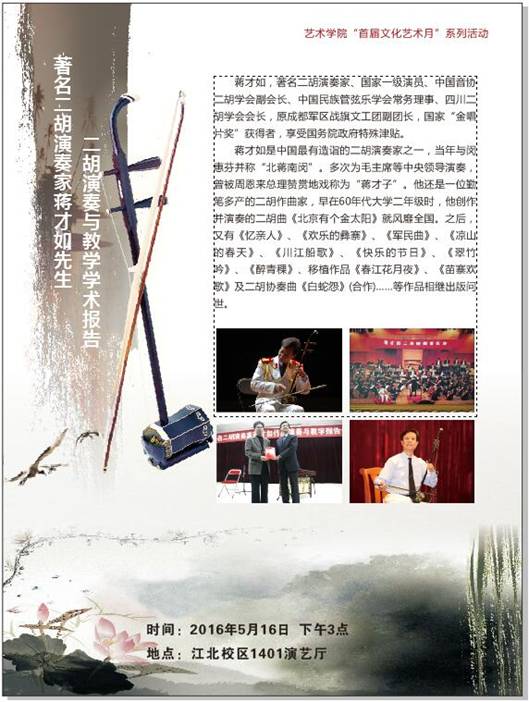 申搏sunbet“首届文化艺术月”——著名二胡演奏家蒋才如先生学术报告公告