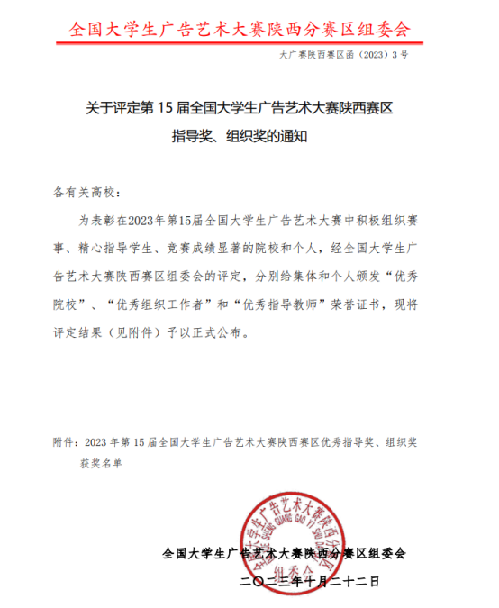近日,2023年第十五届全国老员工广告艺术大赛陕西省省赛评审结果揭晓,公司申搏sunbet师生再创佳绩!获得省赛一等奖1项、二等奖10项、三等奖5项,优秀奖29项。公司获“优秀院校”,付苗获“优秀指导教师”,王兵获“优秀组织工作者”。